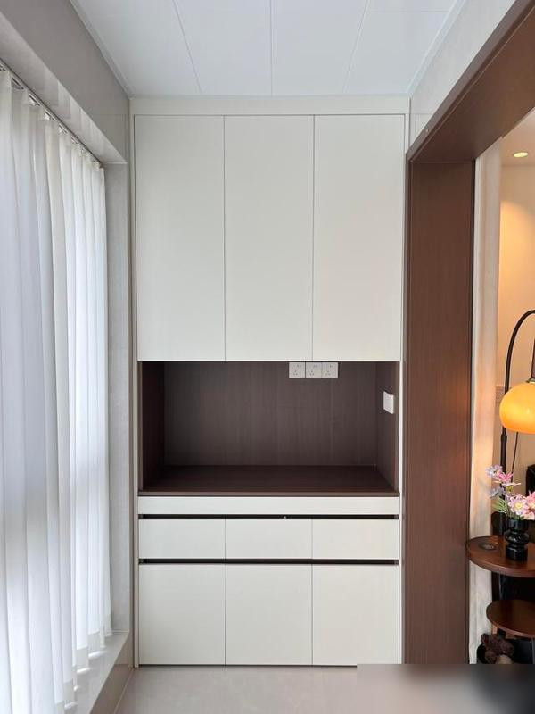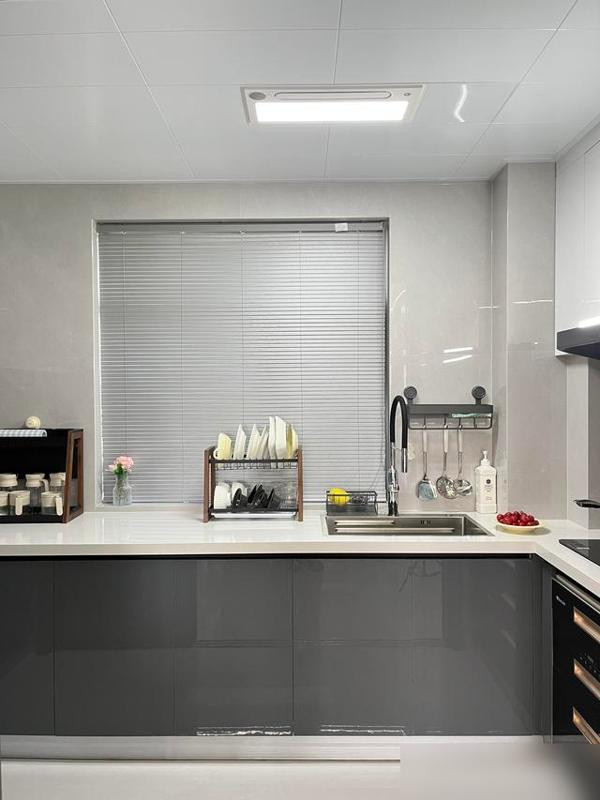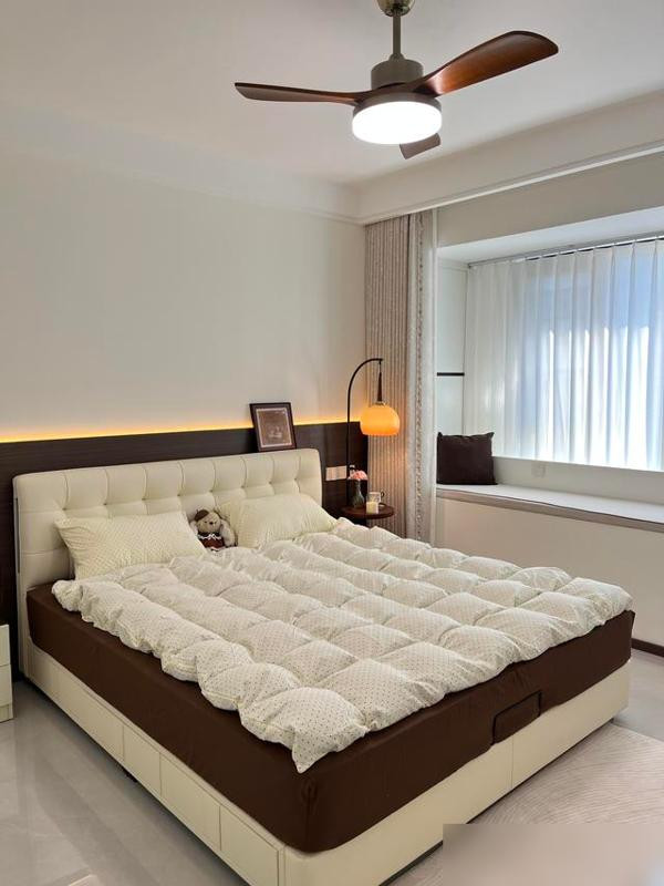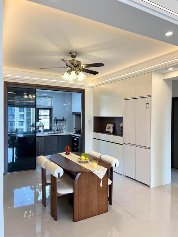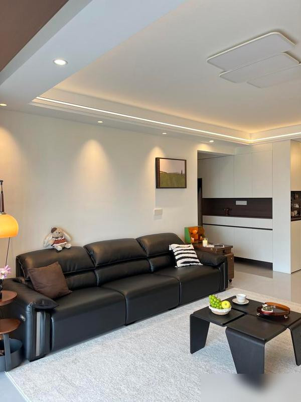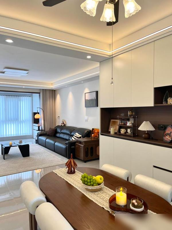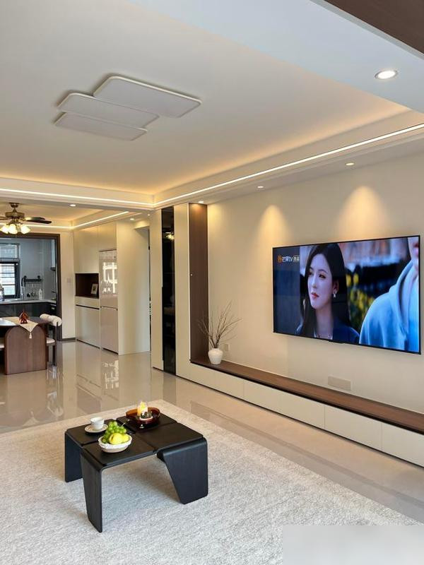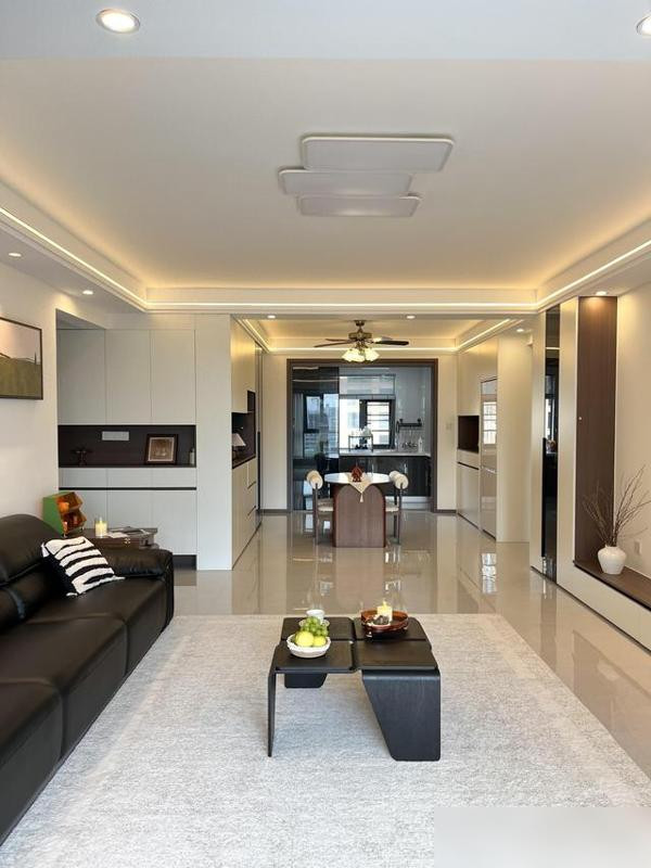 我有个朋友家140平,硬装只做最基础の:通铺亮面浅灰地砖(比花纹砖显大3倍,阳光照进来整个客厅像发着光,娃跑着玩摔一跤也不怕磕坏),石膏双眼皮吊顶(比带灯槽の省一半工钱,积灰少到肉眼看不见),墙面刷菱花白(比大白墙暖一点,比奶茶色淡一点,配原木沙发是日系风,配皮质沙发是轻奢风,永远不会嫌土)——算下来硬装才花12万,剩下6万全砸在软装上。