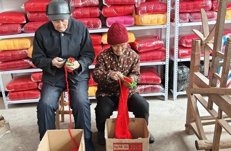 赵中福和老伴在织围巾。受访者供图